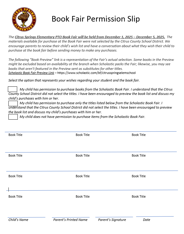Families,Please look for this form to come home with your child on Monday regarding our PTO book fair. In order for your child to be able to purchase items, this form will need to be completed and ...